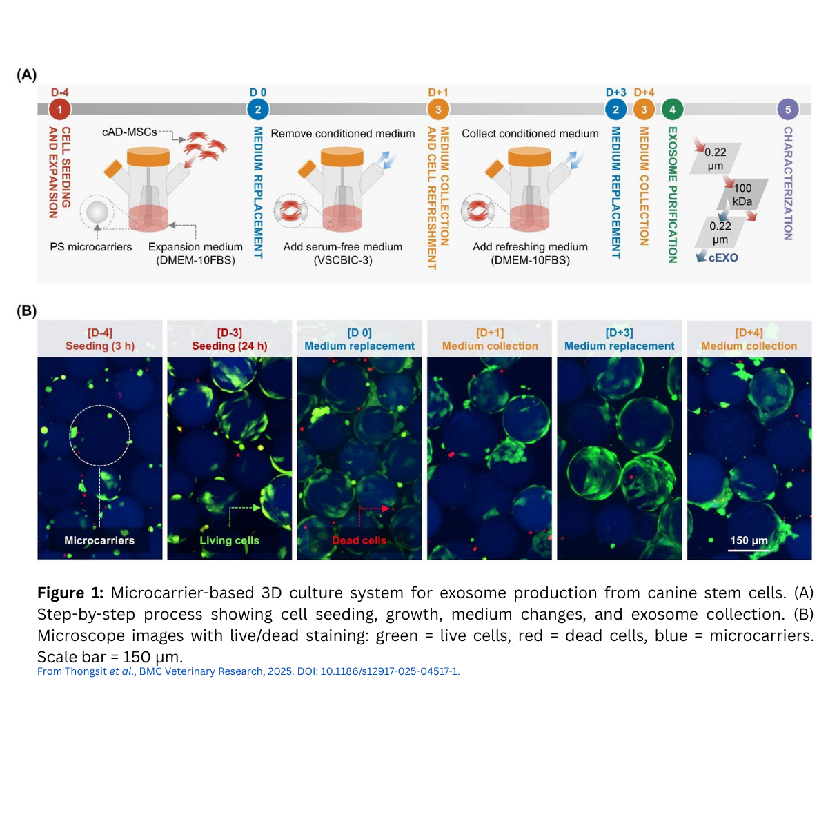 Why it matters: The team evaluated a microcarrier-based 3D culture (spinner flask with polystyrene microcarriers) to make mesenchymal stem cell exosomes (cEXO), which are exosomes derived from canine adipose-derived mesenchymal stem cells (cAD-MSCs). In short, cEXO = “canine MSC exosomes.” They then characterised yield/physicochemical properties, stability, bioactivity, and safety, the critical checkpoints for real-world microcarrier workflows..