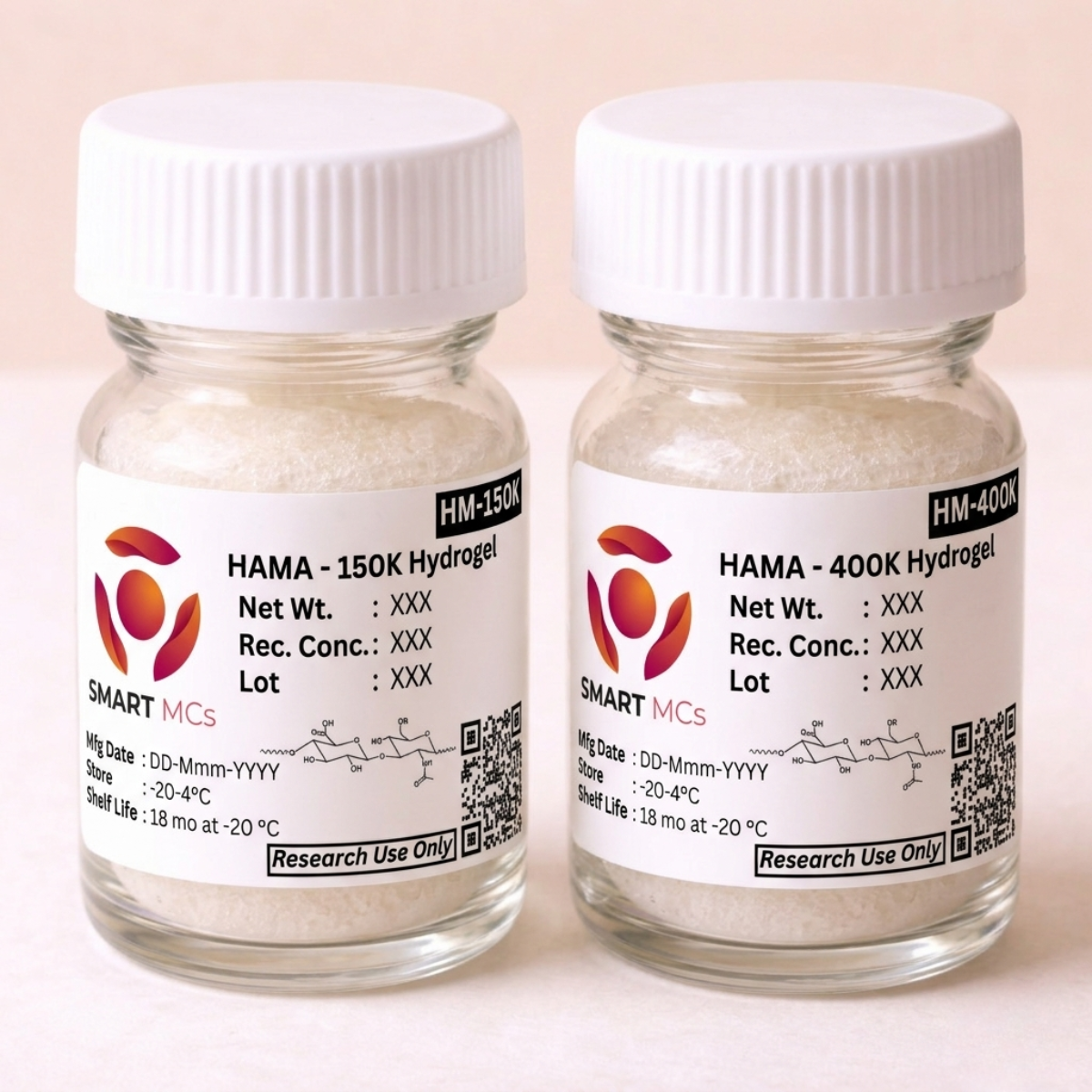 At Smart MCs, HAMA is supplied with a compatible photoinitiator (LAP), enabling fast and reliable light-based crosslinking.